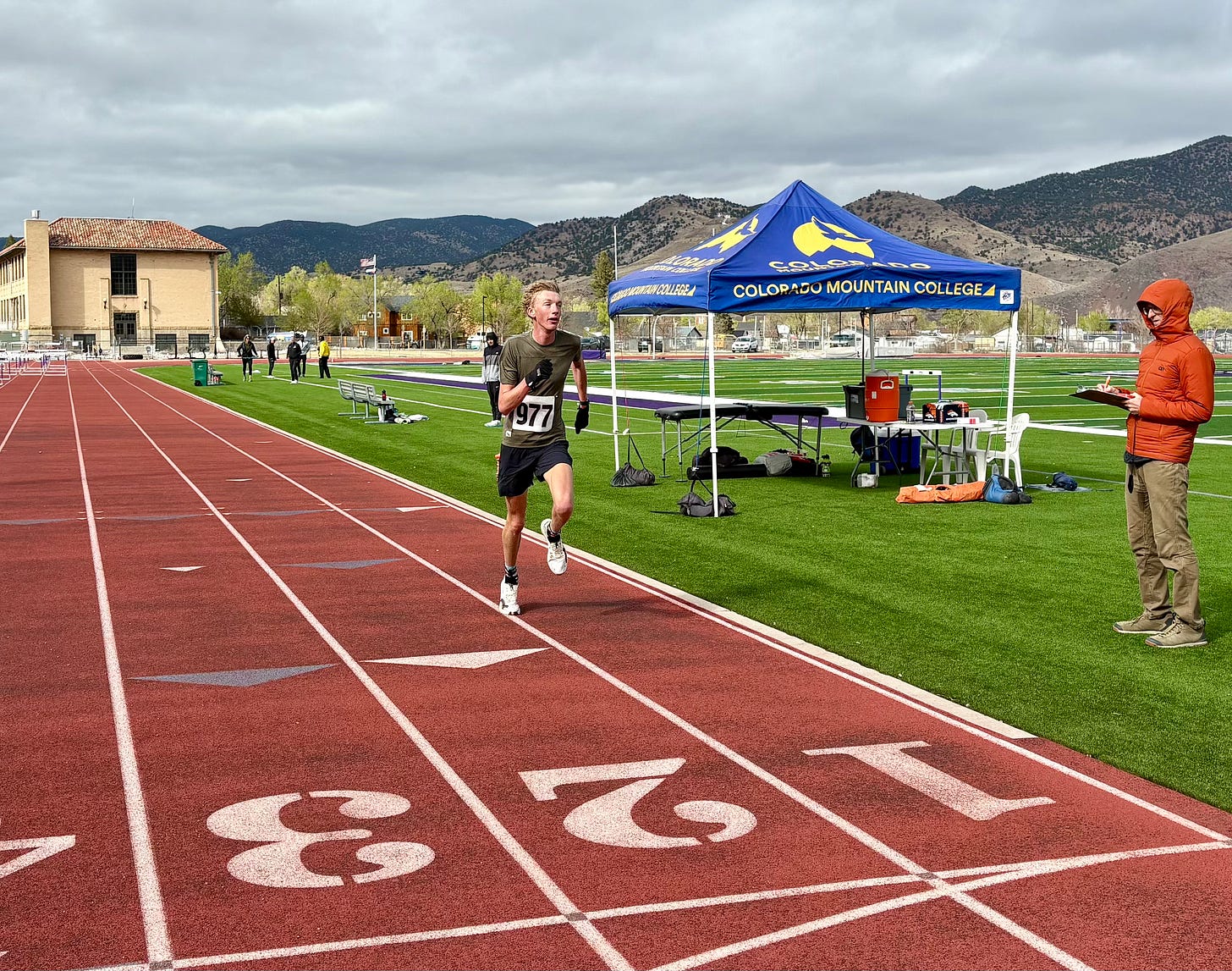 Harrison had not run in a college track meet in two years. He hadn’t done much speed work in recent weeks either. When he stepped out onto the track, it was just him, Central Wyoming’s Henry Nava, and our friend Justin Walker from Salida in the 5K. As our friend Curtis used to say, “Hey, everyone was invited!”