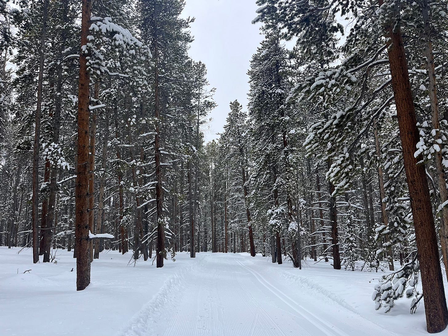 Out among the trees, the fresh snow dampened human noise. The deep cold of winter was gone, but it was not warm at this altitude, and a breeze whispered through the pines. Lodgepole trunks were dark with white highlights, and gusts knocked small avalanches from branches. I skied the classic tracks, but in stretches of trail where the tracks were missing, or on downhills where the double tracks were very tight through the curves, I jumped out of the grooves and skated. The college trails are hilly, and I skied uphill for a mile, crossed the Mineral Belt, onto a short loop, then descended back onto the college trails. Tracks indicated one other skier and a couple of snowshoers were the only others out. The snow seemed soft in contrast to the figurative rock cliff I was up against with Harrison. I was dangerously close to the point of surrender, and maybe letting go was the greatest lesson in all of this. Regardless, in this hour, I found refuge and solace in the snowy forest.